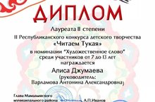 Ученица 1В класса Алиса Джумаева приняла участие во II Республиканском конкурсе детского творчества "Читаем Тукая". Алиса успешно выступила и стала лауреатом II степени в номинации "Художественное слово". Поздравляем Алису и ее руководителя Варламову А.А. Желаем дальнейших успехов и побед!