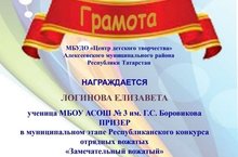 19 февраля прошел муниципальный этап Республиканского конкурса отрядных вожатых "Замечательный вожатый", в котором приняла участие и стала призером в номинации "Самый добрый и отзывчивый отрядный вожатый" ученица 7 класса, активистка ДОО Школьная Галактика Логинова Елизавета. На конкурс Лиза подготовила визитку "Что для меня значит быть вожатым" и сценарий мероприятия. Руководитель Дубровина Н.Б. Поздравляем!