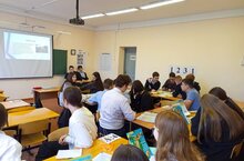 В рамках недели географии урок общения за курс 8 класса был проведён в виде игры. Команды решали задачи, отгадывали зашифрованные в песнях географические объекты, определяли города, субъекты и народы РФ по их характеристикам.