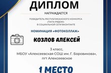 С 21 по 28 февраля 2023 года проходил Республиканский конкурс «Папа рядом», посвящённый Дню защитника Отечества. В данном конкурсе приняли участие учащиеся 3 А класса, Козлов Алексей и Храмушкин Илья, став победителями в номинации «Фотоколлаж». Ребята награждены дипломами 1 и 2 степени.