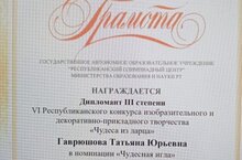 В данном конкурсе педагоги Гаврюшова Т. Ю. и Мигушина В. Е. так же приняли участие в разных номинациях. По результатам Гаврюшова Т. Ю в номинации "Чудесная игла" заняла 3 место. Мигушина В. Е. в номинации "Разноцветные клубочки. Игрушка" заняла 2 место -