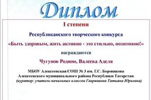 В феврале 2023 года проводился Республиканский творческий конкурс "Быть здоровым, жить активно-это стильно, позитивно!". В номинации лучший проект "Мы за здоровый образ жизни" учащиеся 3Б класса Чугунов Родион и Валеева Аделя стали победителями. Ученица этого же класса Охонина Анастасия приняла участие в номинации Лучшя творческая под названием" Весенее настроение ". В данной номинации Анастасия так же стала победителем. Учащиеся награждены Дипломами 1 степени. К данному конкурсу с учащимися работала учитель начальных классов Гаврюшова Татьяна Юрьевна.