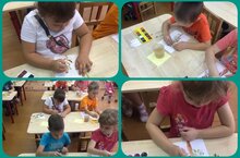 В старшей группе на занятии по рисованию на тему «Яблоня с золотыми яблоками» дети учились создавать сказочный образ, рисовать развесистые деревья; изображать много «золотых» яблок./«Алтын алма белән алмагач» темасына рәсем ясау буенча өлкән төркемдә балалар әкият образы тудырырга, асылмалы агачлар ясарга, күп кенә «алтын» алма сурәтләргә өйрәнделәр.