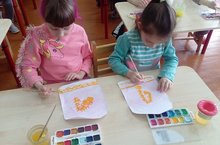 В рамках года родных языков и народного единства дети подготовительной к школе группы на занятии под руководством воспитателя Карповой Л. А. рисовали «Золотое перо» на калфаке. Они учились составлять букетную композицию (золотое перо) на калфаке, рисовали концом кисти одним цветом, сохраняя насыщенность и направление узора желтой краской.
