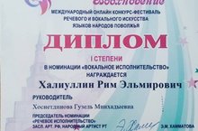 Наш ученик Халиуллин Рим получил свой заслуженный диплом за Международный конкурс речевого и вокального искусства «Илһамият», который прошёл в конце 2020 года. Он занял в нем 1 место! /Безнең укучыбыз Хәлиуллин Рим үзенең атказанган дипломын «Илһамият» халыкара сөйләм һәм вокал сәнгате конкурсы өчен алды. Ул анда 1 урын алды! 15.02.2021