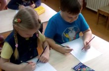 На занятии по математике дети старшей группы рисовали геометрические фигуры двумя руками одновременно. Им это задание показалось очень интересным и увлекательным.