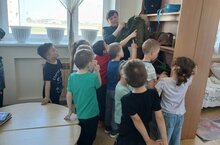 В рамках проектной деятельности, посвящённой к 80-летию Великой Победы, дети старшей группы посетили школьный музей Боевой Славы. Во время посещения музея ребята узнали много интересного о событиях ВОВ, о мужестве наших прадедов. Они познакомились с предметами военного времени, рассматривали экспонаты. Среди них каски, фляжки, личные вещи участников войны. Также рассматривали стенд с фотографиями, письмами, книгами.