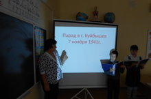 20.10.2014 в 4 классе прошел "Урок мужества"по теме "Парад в городе Куйбышев 7 ноября 1941 года". Целью которого оказание помощи в нравственном становлении подростка как личности в формировании нравственного идеала и воспитании патриотических качеств через изучение истории героизма советских людей в годы Великой Отечественной войны. Где было отмечено, что Куйбышев - в те годы был запасной столицей нашей страны. Парад в Куйбышеве так же должен был продемннстрировать всему миру, что у советского народа достаточно сил и техники, чтобы противостоять врагу. Парад начался в 10 часов и продолжался 1,5 часа, да еще больше часа шла демонстрация трудящихся из 178 тысяч человек.