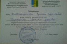 5 декабря учитель начальных классов нашей школы-детского сада Залалитдинова Ч.И. ездила на республиканский семинар педагогических работников в г. Нижнекамск. Где выступила по теме: "Секреты здоровья". После этого ей был вручен Сертификат.