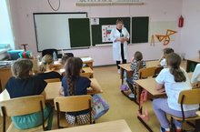 Медицинский работник провела ,,Минутку здоровья" с воспитанниками пришкольного лагеря. Она напомнила ребятам о необходимости соблюдения санитарных правил для сохранения здоровья: о личной гигиене, правильном питании, занятиях спортом./Медицина хезмәткәре мәктәп яны лагеренда тәрбияләнүчеләр белән сәламәтлек минуты үткәрде. Ул балаларга сәламәтлек саклау өчен санитар кагыйдәләрне үтәү кирәклеген искәртте.