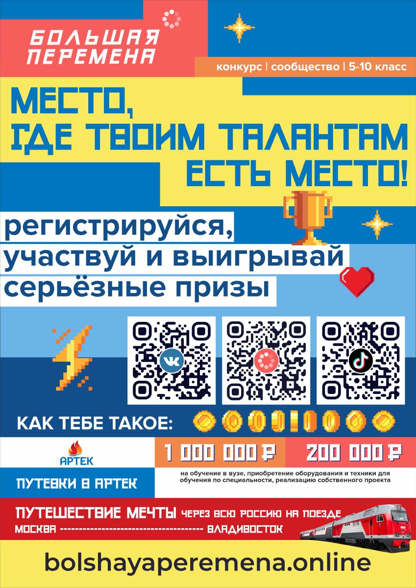 Началась регистрация на всероссийский конкурс «Большая перемена» в 2021 году. Цель конкурса – помощь учащимся раскрыть те способности, которые не попадают в традиционную систему обучения в школе и соответствующие предметные олимпиады. Все мы – разные. «Большая перемена» намерена доказать, что не только олимпиадник, условно, по химии и математике, может быть успешным. Кто может участвовать? Участие в «Большой перемене» в 2021 году наряду со старшеклассниками и студентами сузов смогут принять и учащиеся 5-7 классов.
