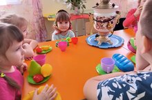 Ә соңыннан балалар рольләргә бүленеп, ,Гаилә"сюжетлы -рольле уенын уйнадылар.Зур гаиләдә ,,әти -әни",,,әби -бабай"һәм балалар самовар артында тәмләп, чәй эчтеләр".