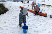 Дети с удовольствием провели на прогулке время, лепя из мокрого снега комки, ,,торты", ,,пироги".
