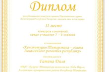 Учащаяся 8 класса Гатина Диля заняла 2 место в Республиканском конкурсе в рамках парламентского урока "Конституция Республики Татарстан: двадцать пять лет истории" в номинации "Конституция Татарстана -основа динамического развития республики"