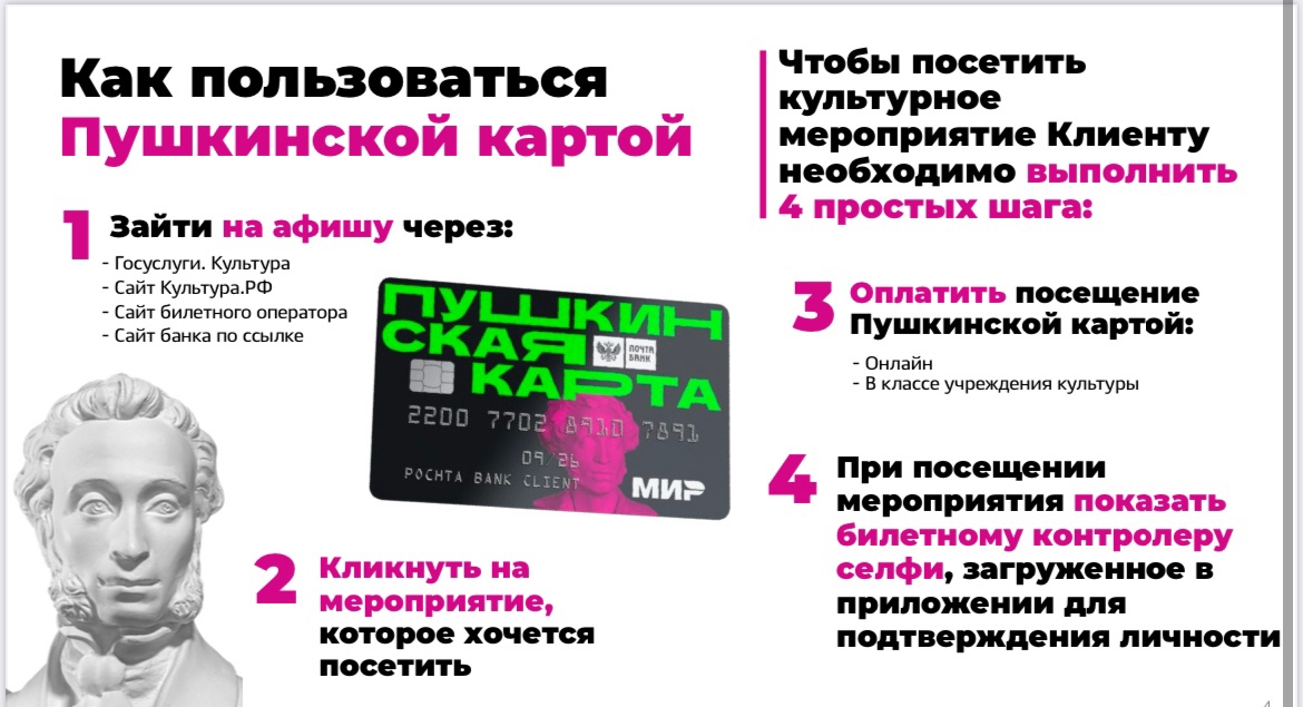 Пушкинская карта — твой билет в мир искусства! Только представь: театры, музеи, выставки и концерты всего за пару кликов! Уже мечтаешь о культурной программе? Тогда скорее активируй свою карту и погружайся в атмосферу творчества и вдохновения! #ПушкинскаяКарта #ИскусствоДоступноВсем #КультураИТворчество