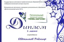 В январе месяце прошел Региональный творческий конкурс «Зимние фантазии». Организаторы конкурса МАУДО города Набережные Челны «Детско-юношеский центр №14», ГАПОУ «Набережночелнинский колледж искусств». По результатам конкурса обучающиеся нашей школы удостоены Дипломов. В номинации «Рисунок» Нотфуллина Гульназ и Евдокимов Радмир 1 место, Хаметова Алина и Романова Елизавета 2 место, в номинации «Поделка» Мардиев Самат и Гарипова Ильвина 1 место Лычникова Дарья 2 место. Поздравляем.