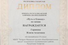 С 19 по 21 января прошёл заключительный этап республиканской олимпиады по химии «Путь к Олимпу» среди школьников 8-11 классов общеобразовательных организаций Татарстана. В олимпиаде приняли участие 151 ученик из 40 муниципальных районов республики. Ребятам было предложено решить 6 задач, относящихся к различным разделам химии. Их работы оценивали сотрудники Химического института имени А.М.Бутлерова КФУ. Призёрами стали 67 школьников из 30 муниципальных районов Татарстана. Поздравляем призера олимпиады Гарипову Илюзю и педагога Искандарову А.Д.. Дальнейших успехов вам.