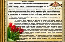 В субботу 21 апреля учащиеся школы приняли участие в международной акции «Тест по истории Великой Отечественной войны». Этот тест под названием «Я знаю, я горжусь!» прошел в он-лайн режиме. Многие ученики, ответив правильно и полно на поставленные вопросы, показали хорошее знание истории отечественной войны. Скажем, Галлямова А. набрала 25 баллов из 30 возможных. Они получили специальные сертификаты.