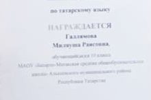 Призером республиканской олимпиады по татарскому языку стала ученица 10 класса Галлямова Миляуша. Ее подготовила учитель татарского языка высшей квалификационной категории Хафизова Виля Гарифулловна. Поздравляем!