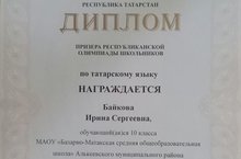 С 6 по 8 февраля 2018 года на базе ГАОУ «Республиканский олимпиадный центр» Министерства образования и науки Республики Татарстан прошла республиканская олимпиада школьников по татарскому языку. Байкова Ирина ученица 10 класса и Карманаева Дарья ученица 9 класса стали призерами олимпиады. Их подготовила учитель татарского языка и литературы Гатауллина Гульнур Харисовна. Поздравляем!!