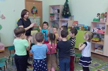Воспитатель по обучению русскому языку проводит занятие в старшей группе. В игровой форме разучивают стихотворение И.Сурикова "Вот моя деревня".