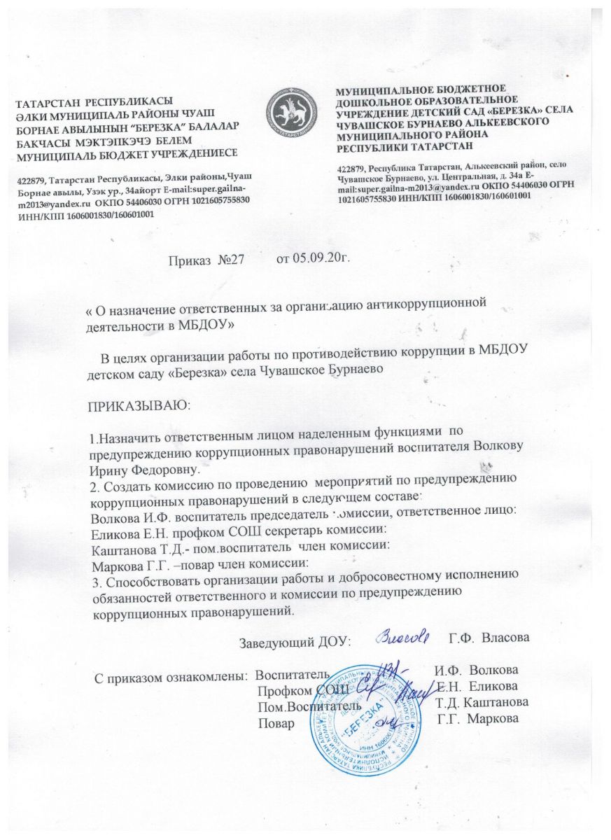 Приказ " О назначение ответственных за организацию за антикоррупционной деятельности в МБДОУ"