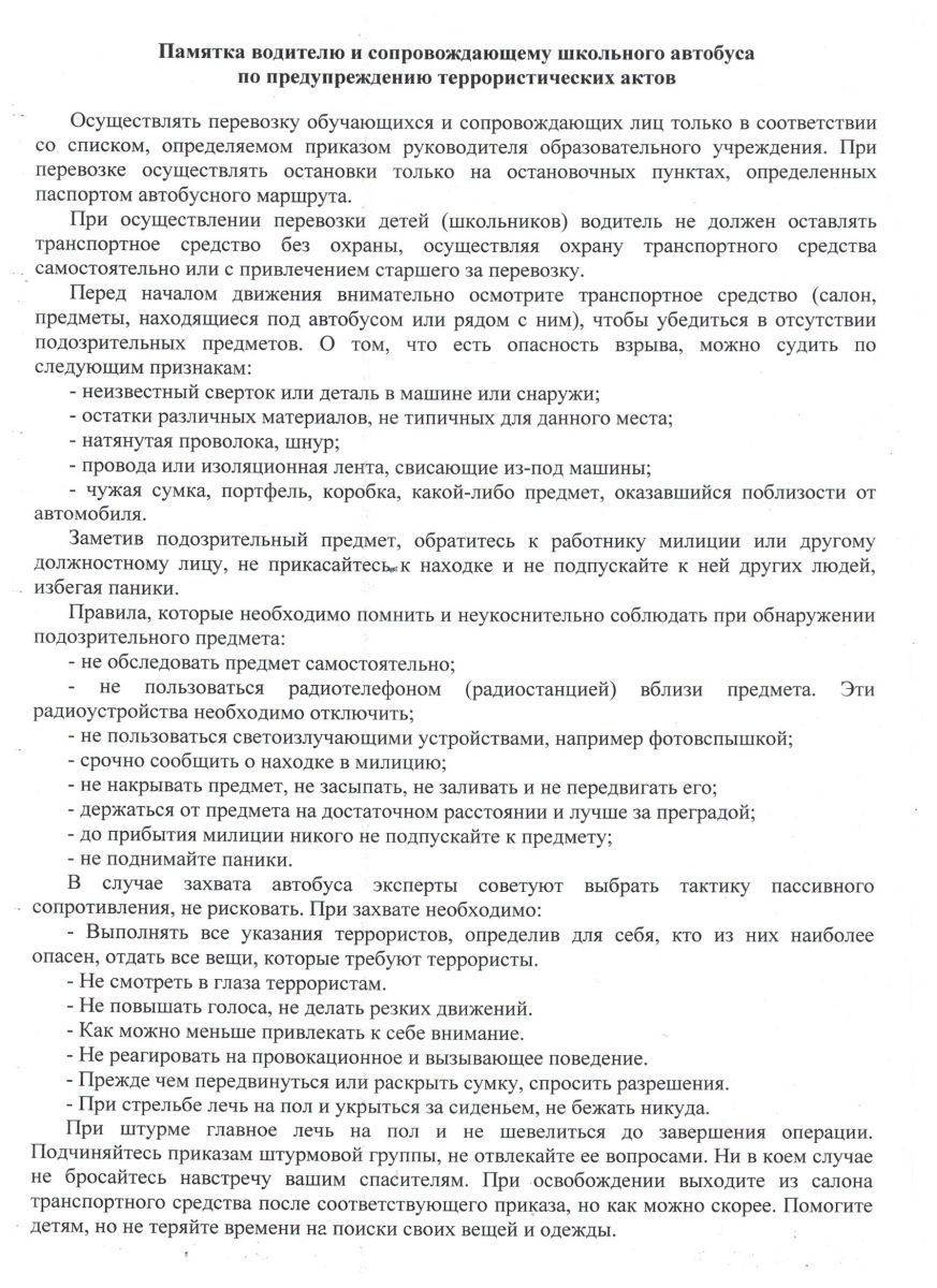 Памятка водителю и сопровождающему школьного автобуса по предупреждению террористических актов