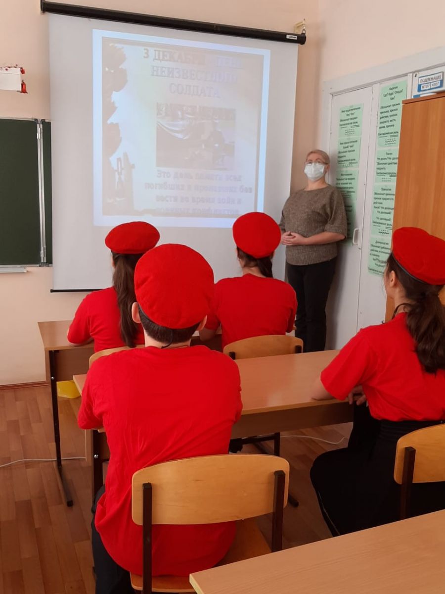 3 декабря –«День неизвестного солдата в России». В этот день отряд юнармейцев возложили венок возле памятника «Воину –освободителю». В школе в каждом классе прошел Урок мужества «Имя твое неизвестно, подвиг твой бессмертен», посвященное Дню Неизвестного солдата. Учащиеся узнали, когда образовалась традиция, по которой в разных странах устанавливались памятники Неизвестному солдату.