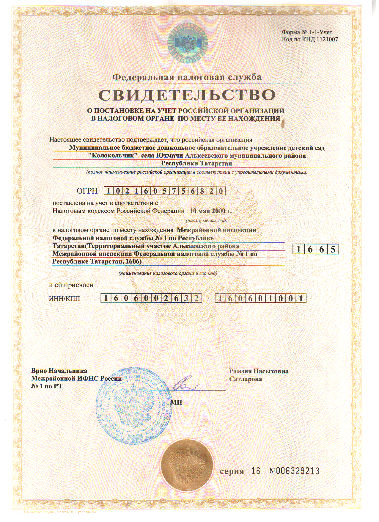 Свидетельство о постановке на учет Российской организации в налоговом органе по месту ее нахождения