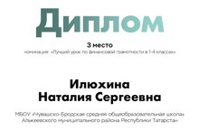 На основании письма Министерства образования и науки РТ № 11803 от 02.09.2022 «О проведении Республиканского конкурса педагогического мастерства «Лучший урок финансовой грамотности» и приказа МКУ Управления образования № 348 от 26.09.2022 был проведен муниципальный этап Республиканского конкурса педагогического мастерства «Лучший урок финансовой грамотности». На конкурс было представлено 14 работ. На основании материалов, представленных жюри были подведены итоги конкурса и определены победители конкурса. Лучшие работы были представлены на Региональный этап. Дипломантом республиканского конкурса стала учитель начальных классов Чув.Бродской СОШ Илюхина Н.С.