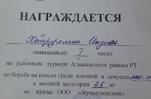 Учащийся 7 го класса Хайруллин Инзиль стал победителем на районном турнире Алькеевского района РТ по борьбе на поясах среди юношей и девушек 2008-2011 года рождения в весовой категории 45 кг на призы ООО"Хузангаевский". Сердечно поздравляем! Желаем дальнейших успехов!