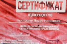 Молодежный парламент при Государственной Думе, молодежные парламенты субъектов Российской Федерации реализуют международный проект "Большая история", направленный на историческое просвещение. В числе просветительских, образовательных, и благотворительных мероприятий ежегодно, с 2015 года проводится Международная образовательная акция "Тест по истории Великой Отечественной войны". Учащиеся 9 класса нашей школы тоже стали участниками этой акции.(Учитель истории Фатхуллина М. Ф.) Далее: