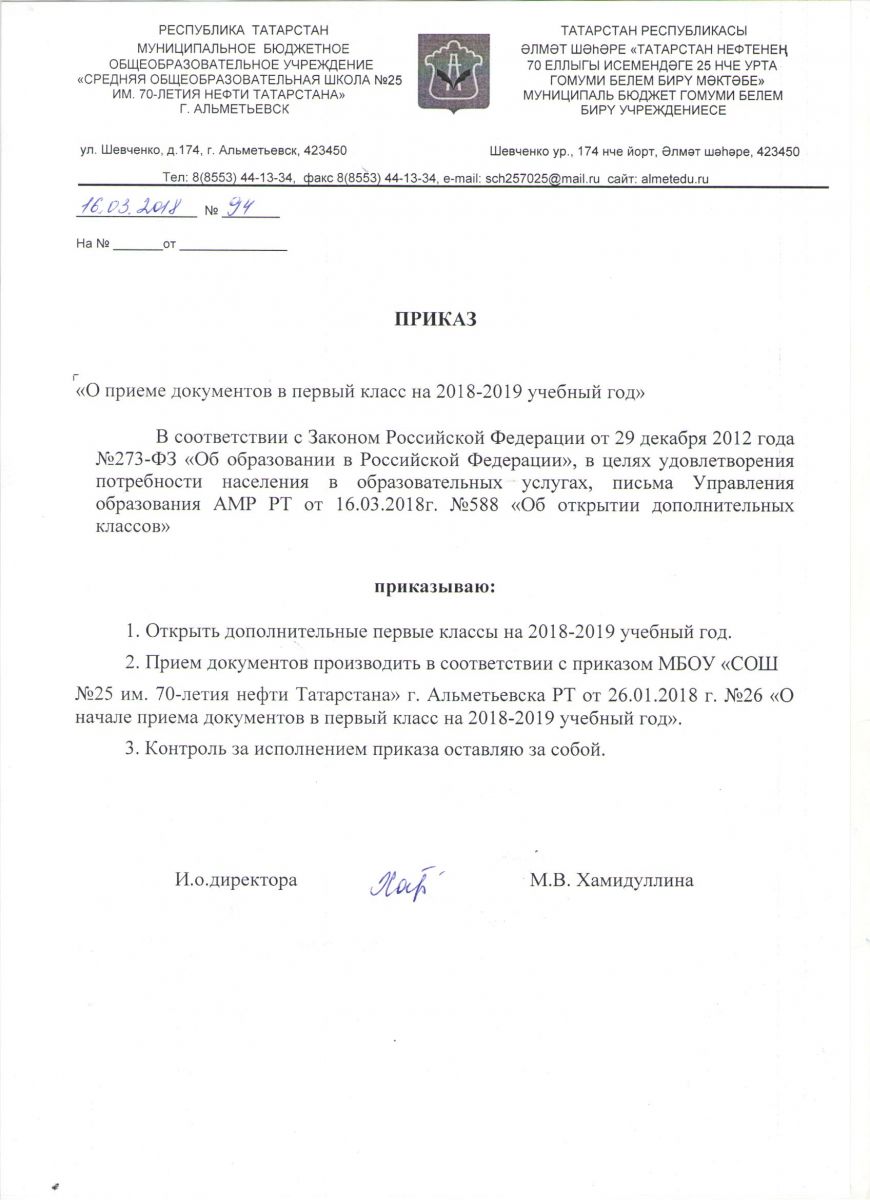 Объявление!С 19 марта объявляется дополнительный набор в 1 класс на 2018-2019 учебный год.Прием документов с 13.00ч. до 16.00ч с понедельника по пятницу на 1 этаже школы.Ознакомится с нормативными документами--https://edu.tatar.ru/almet/25school/page2781571.htm