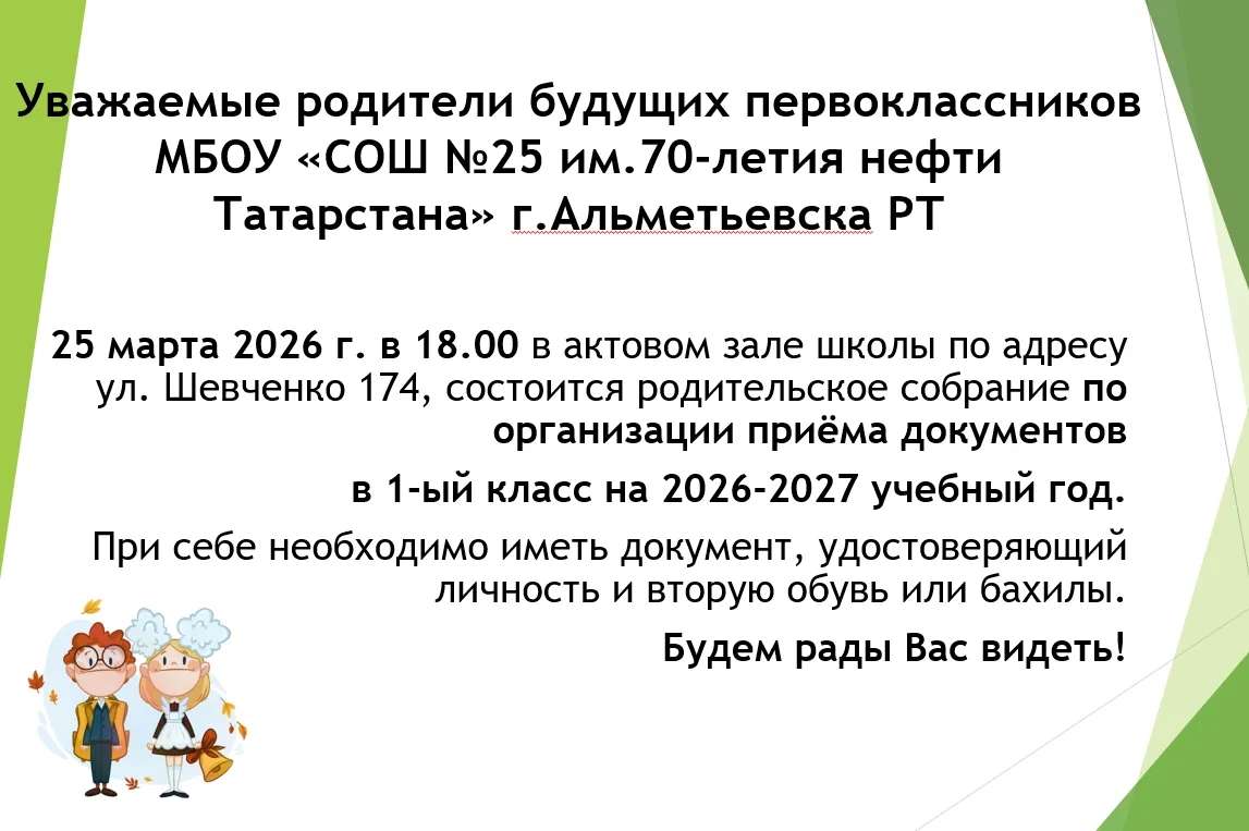 Опубликовано: 18.03.2026Уважаемые родители будущих первоклассников МБОУ «СОШ Nº25 им. 70-летия нефти Татарстана» г.Альметьевска РТ