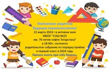 21 августа 2024 года в 18.00ч. в МБОУ "СОШ №25 им.70-летия нефти Татарстана" состоится родительское собрание.