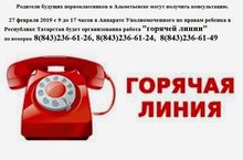 27 февраля 2019 года с 9 до 17 часов в Аппарате Уполномоченного по провам ребенка в Республике Татарстан будет организованна работа "ГОРЯЧЕЙ ЛИНИИ" по номерам: 8(843)236-61-26, 236-61-24, 236-61-49