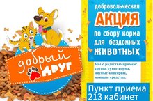 В рамках декады «Счастье», которая проходит в нашей школе с 10 по 20 марта, в нашей школе проходит добровольная акция по сбору кормов для бездомных животных. Весь собранный корм и средства гигиены будут переданы в приют для животных "Кошкин дом".