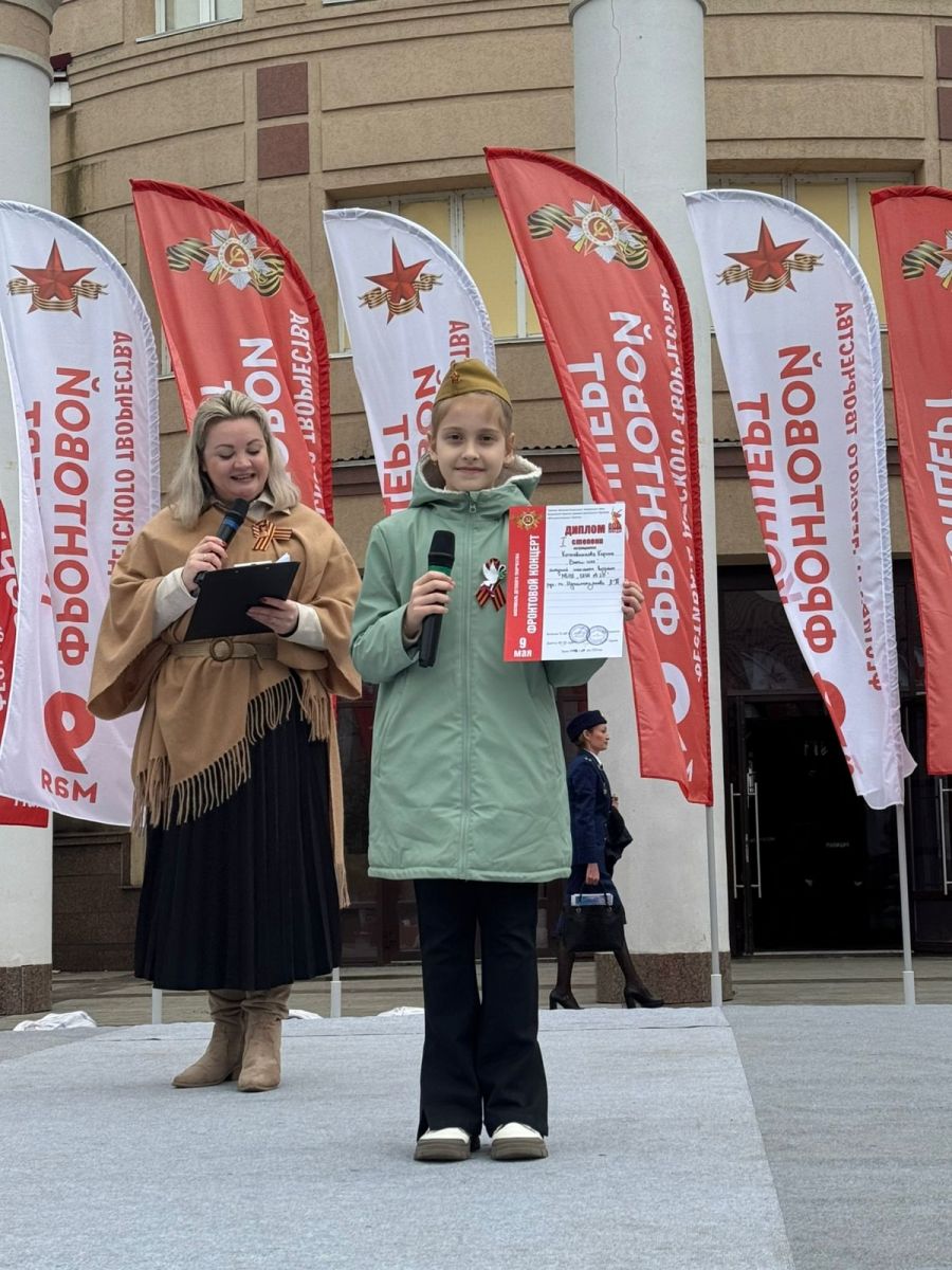 Городской фронтовой концерт, состоявшийся на площади за Драмтеатром, стал настоящим праздником для жителей города. Наша ученица 2Д класса Кожевникова Карина исполнила песню военных лет и завоевала 1 место!
