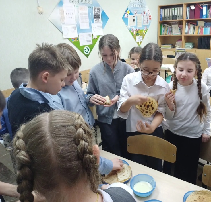 Чаепития проходили в каждом классе и были организованы по‑семейному тепло. Ребята расставили столы, накрыли их нарядными скатертями, расставили чашки и блюдца с блинами.