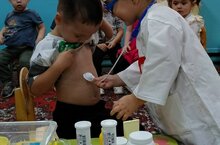 А в первой младшей группе - сюжетно-ролевая игра «Больница». Дети младшего возраста еще с трудом могут самостоятельно распределять роли в игре, и в этом им помогает воспитатель.