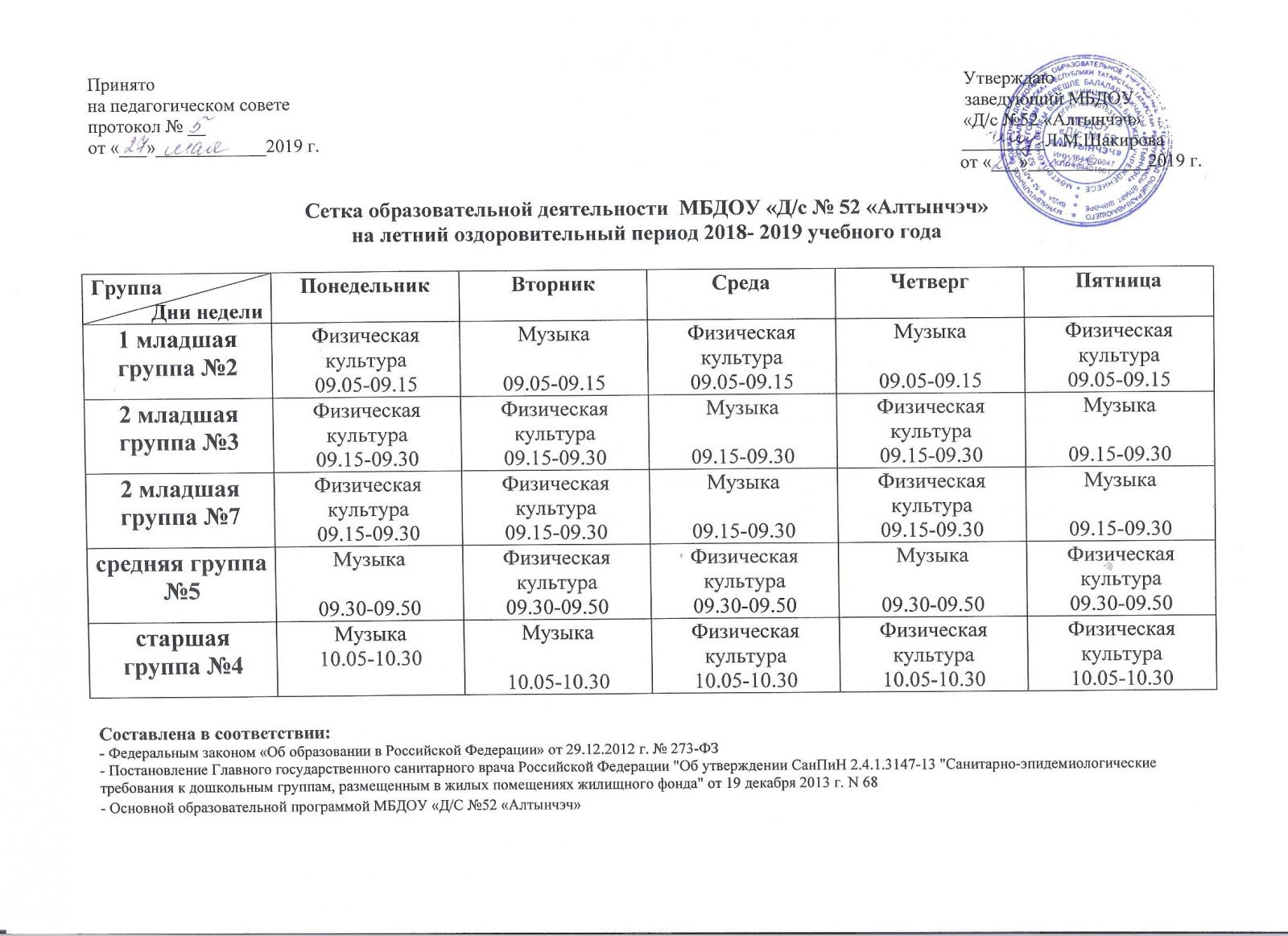 Сетка образовательной деятельности на летний период