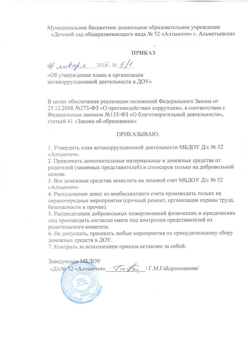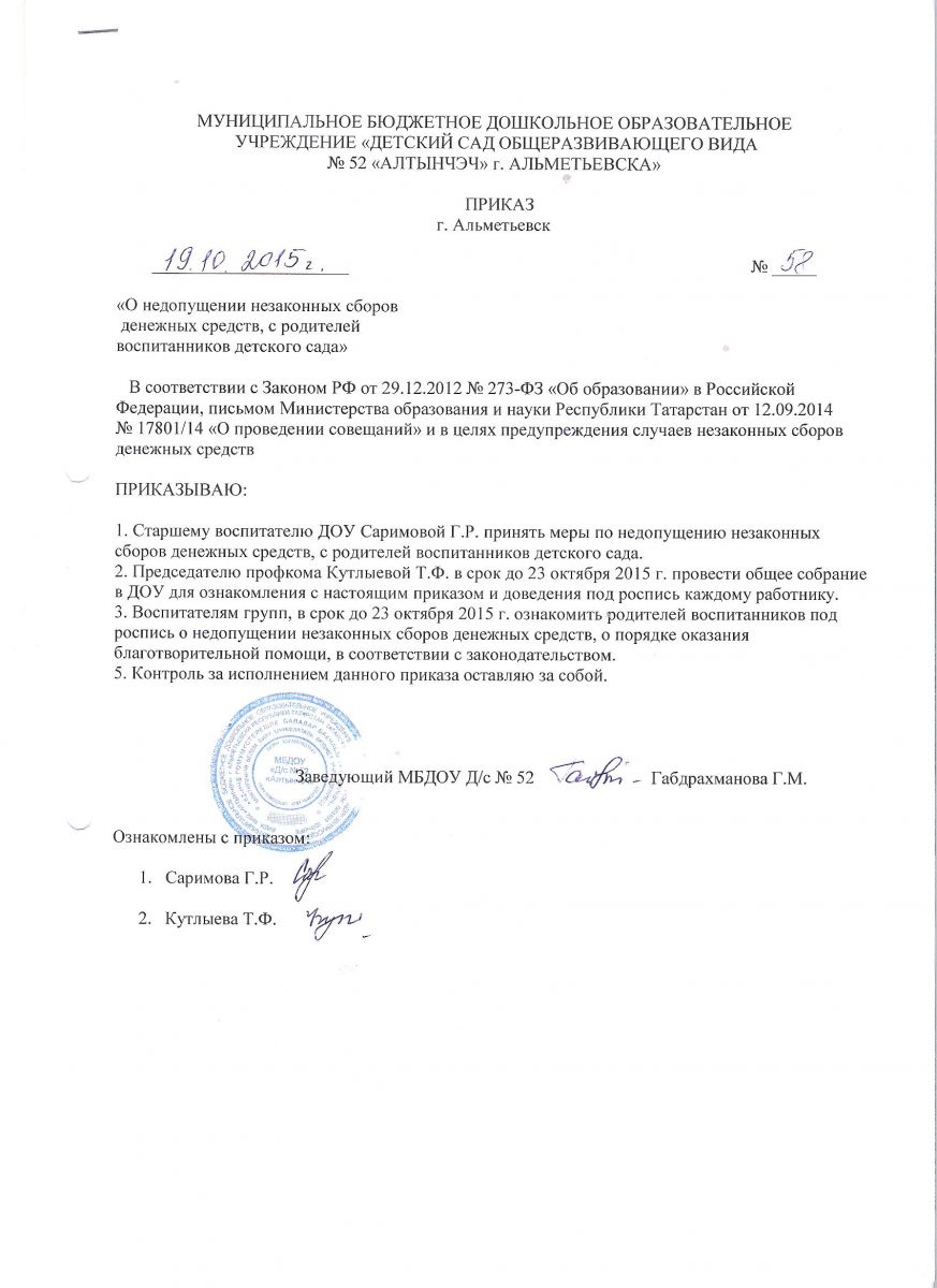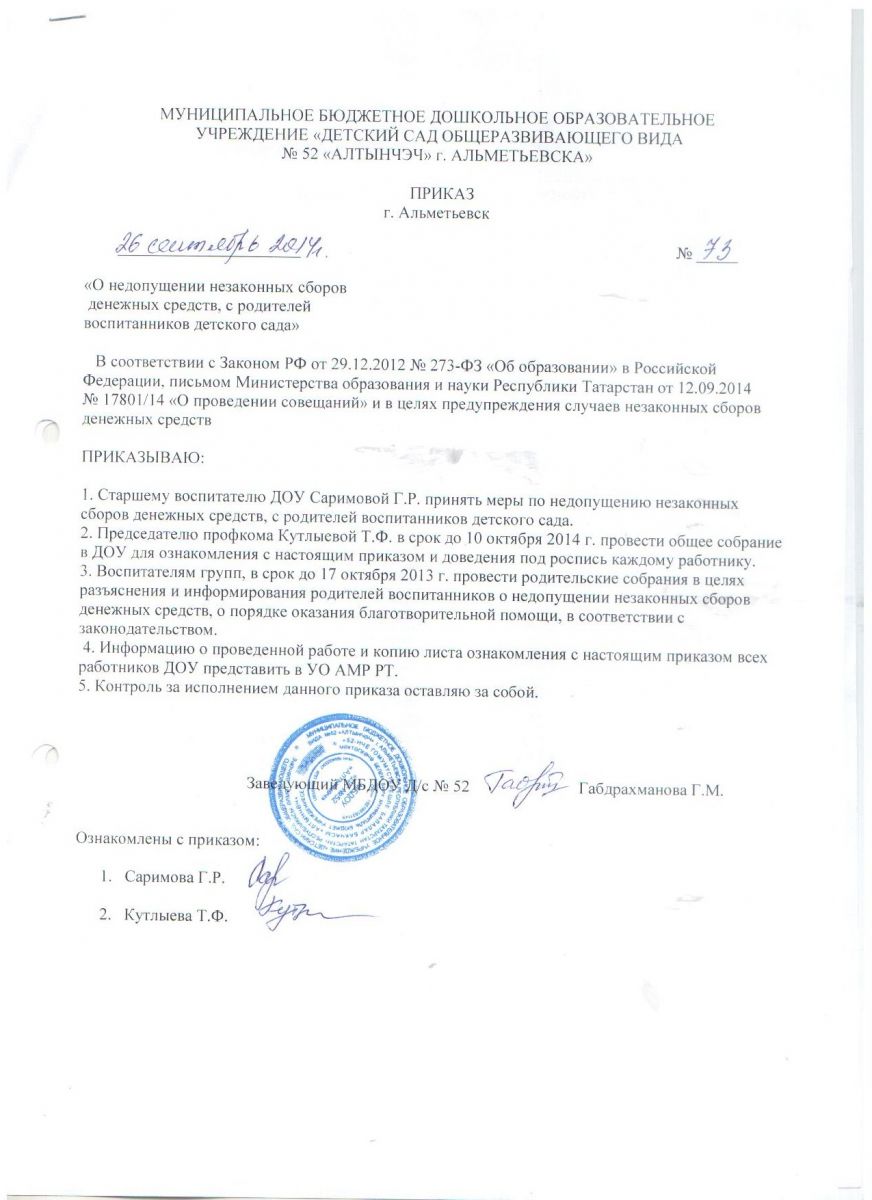 Приказ Управления образования "О недопущении незаконных сборов денежных средств"- http://almetedu.ru/Antikorupcia/prikaz_1276.pdf
