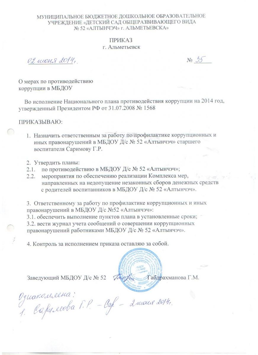 Приказ об утверждении плана и организации антикоррупционной деятельности