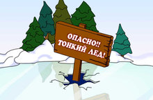 Тут надо быть особо осторожным и не забывать о безопасности детей в зимнее время на природе. В незнакомых местах лучше вообще не выходить на лёд, а если все-таки выходите, то должны знать что безопасная толщина льда на 1 человека, массой 100 кг, 10 см, на расстоянии 5 метров от берега. Но даже в этом случае лед лучше всего проверить, ударяя по нему пешней или острой арматурой. В местах, где под водой бьют ключи лёд всегда тоньше, замерзает позже, а оттаивает раньше. Осенью и весной на лёд лучше всего выходить с веревкой, которую привязывают на берегу или подстраховываются людьми, которые остаются на берегу. Еще неплохо иметь с собой спасалку (две острых небольших пешёнки, которые привязываются к 1,5 метровой веревке и вешаются на шее) или два гвоздя 100-150 мм. В случае если провалитесь, сможете с их помощью выкарабкаться животом на лёд.