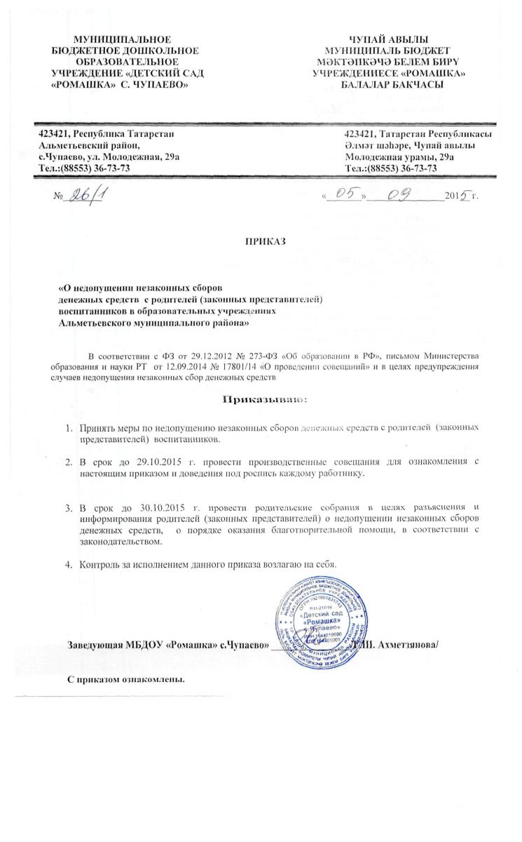 Приказ о не законном сборе денежных средств с родителей воспитанников 2015 год