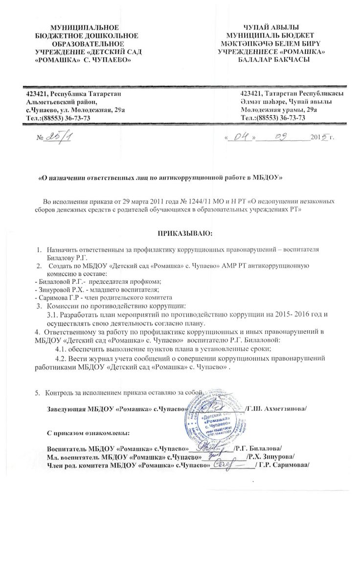 Приказ о назначении ответственных лиц по антикоррупционных работе 2015 г.