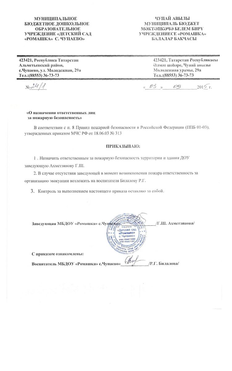 3.10 Приказ оназначении ответственных лиц за пожарную безопасность 2015 г