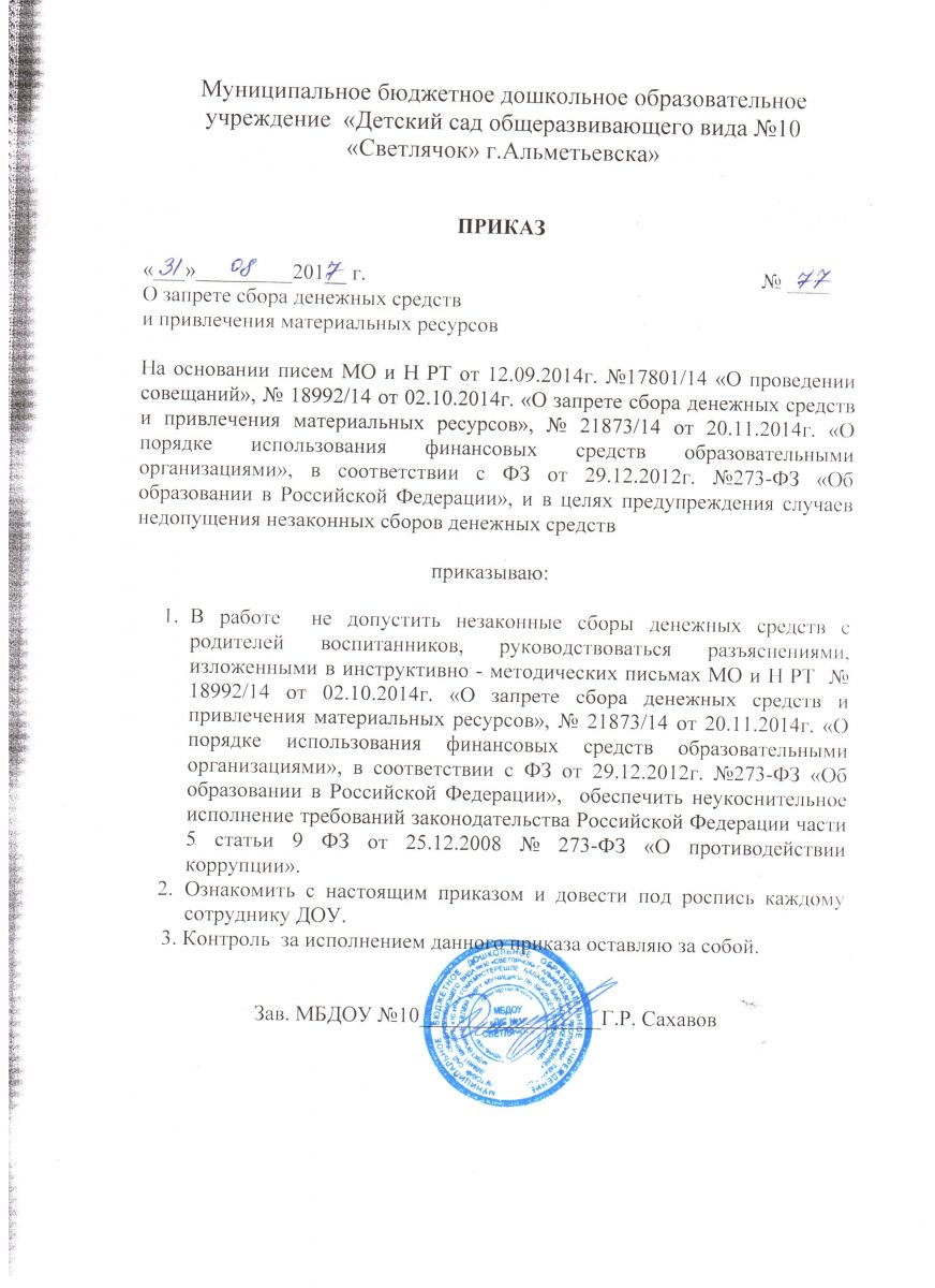 Приказ МО и Н РТ №1244/10 от 29.03.2011 г. "О недопущении сбора денежных средств"