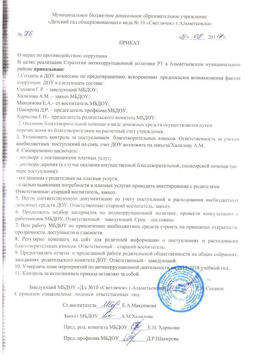 Приказ №76 "О мерах по противодействию коррупции" на 2017-2018 учебный год