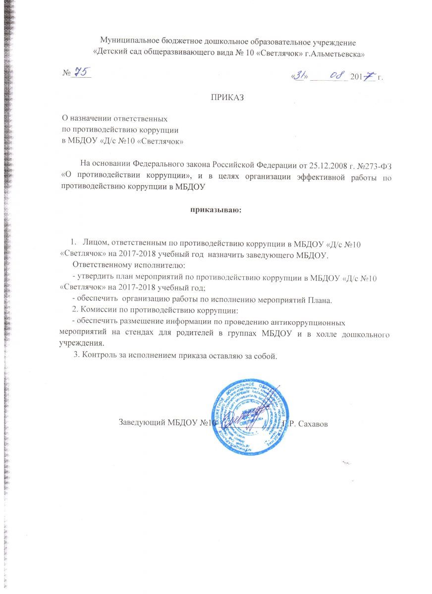 Приказ №75 "О назначении ответственных по противодействию коррупции" на 2017-2018 учебный год